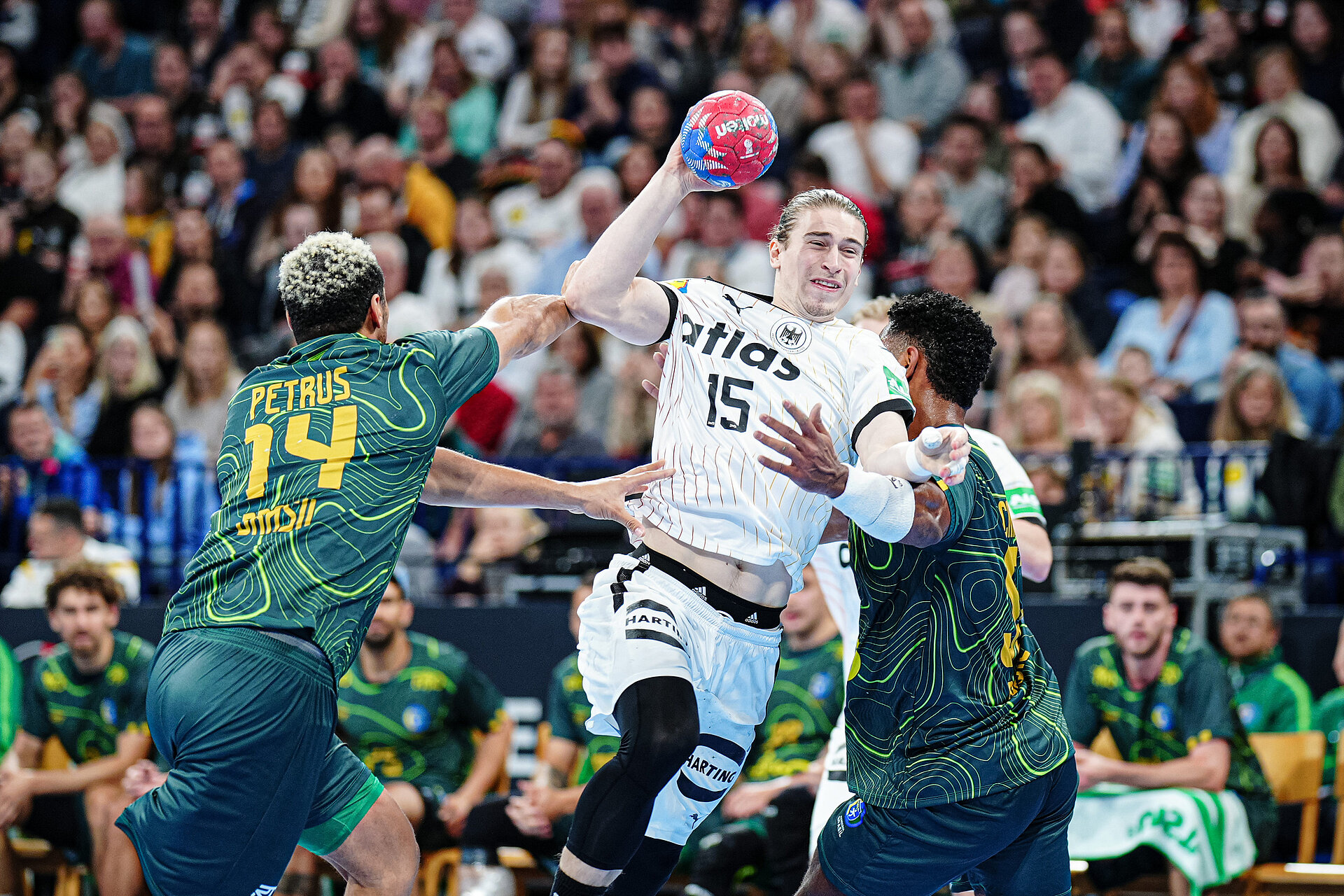 Mit 28:26 hatte der Silbermedaillengewinner von den Olympischen Spielen in Paris am Sonnabend in Hamburg gegen Brasilien sein letztes Vorbereitungsspiel auf die WM, die an diesem Dienstag eröffnet wird und für Deutschland am Mittwoch (20.30 Uhr/ARD) im dänischen Herning gegen Polen beginnt, zwar gewonnen. Dazu jedoch war in den letzten 15 Spielminuten eine deutliche Leistungssteigerung, gepaart mit einem klaren Kraftverlust der Gäste aus Südamerika, notwendig gewesen. Zur Halbzeit hatte die Auswahl von Bundestrainer Alfred Gislason noch mit 13:17 hinten gelegen und dabei in erschreckendem Ausmaß freie Torwürfe vergeben, die Brasiliens Torhüter Rosa beinahe zum Helden eines maximal mittelmäßigen Spiels gemacht hätten.