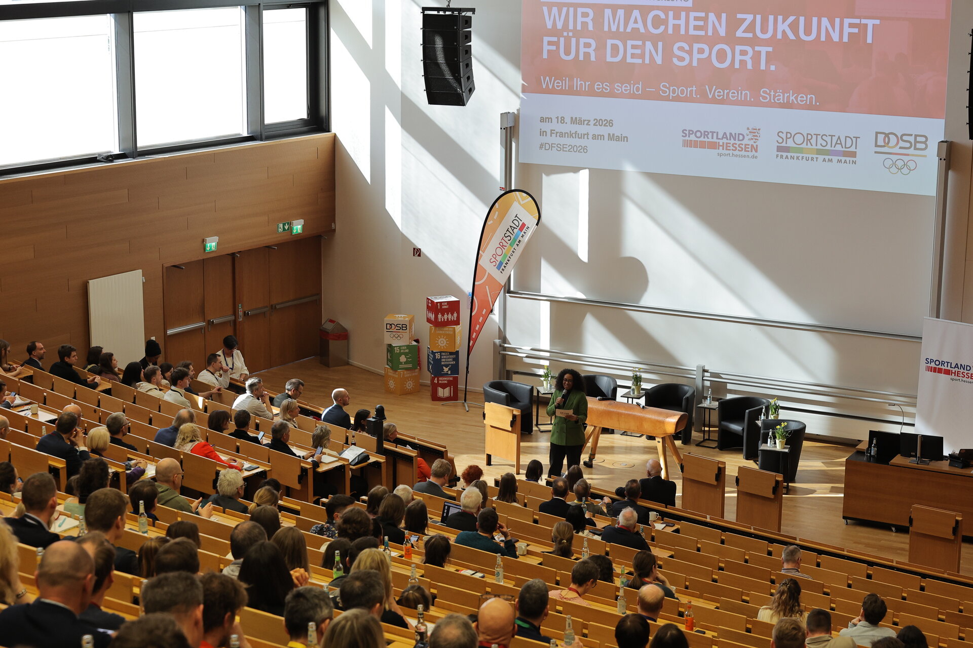 Ann Kathrin Linsenhoff war ehrlich beeindruckt. „Dass diese Veranstaltung so gut besucht ist, zeigt, wie sehr uns allen die Sportentwicklung am Herzen liegt“, sagte die Sportbeauftragte des Landes Hessen, die 1988 in Seoul mit der Dressurreit-Equipe Olympiagold gewonnen hatte, während sie bei ihrer Begrüßungsrede für den abendlichen Frühlingsempfang ihren Blick über die sehr gut gefüllten Sitzreihen im Hörsaal 2 auf dem Campus Westend der Frankfurter Goethe-Universität schweifen ließ. Nahezu 500 Menschen waren am Mittwoch der Einladung des Deutschen Olympischen Sportbundes (DOSB) gefolgt, um auf dem Dialogforum Sportentwicklung über die Herausforderungen zu diskutieren, die in den kommenden Jahren auf den organisierten Sport warten. Die Quintessenz eines spannenden Tages lautete: Es kommen schwierige Zeiten, aber die Sportverantwortlichen haben sowohl die Lust als auch die Energie, diese zu meistern.